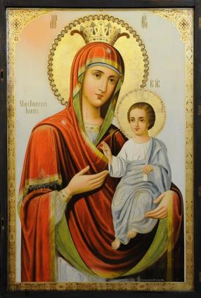 Icoana este pictata la Sfantul Munte Athos in anul 1930, se crede ca la schitul romanesc "Prodromu". Ctitorii sunt trecuti pe strana care incadreaza icoana, doar ea, avand aproximativ 2m. Atat icoana cat si strana sunt din lemn de tisa.